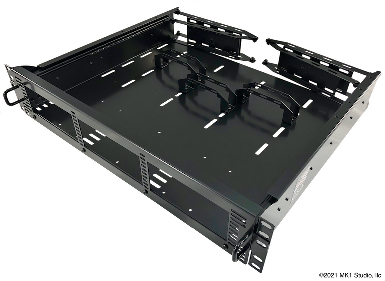 The NK-RS-2U (2X or 3X faceplate) rack-mount server adaptor for the Intel® NUC Mini PC’s (“H” height, chassis-117 x 112 x 56mm). This unit has a 13.5” ball bearing for easy slide out access for the Mini PC’s. Each unit is held horizontally to allow for maximum PC density in 2U of rack space. The included double wire management feature allows for data and power to be separated. This feature also allows the Mini PC’s to stay running when slid out for easy access to the rear ports as well as servicing a single unit without taking the others offline. The Mini PC’s are secured from below with 3mm x 10mm screws with ample locations for cable ties. The power supply clamps have a cable spooling feature on top to easily wind up extra power supply cable length.